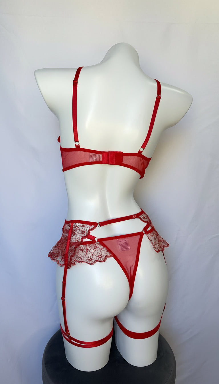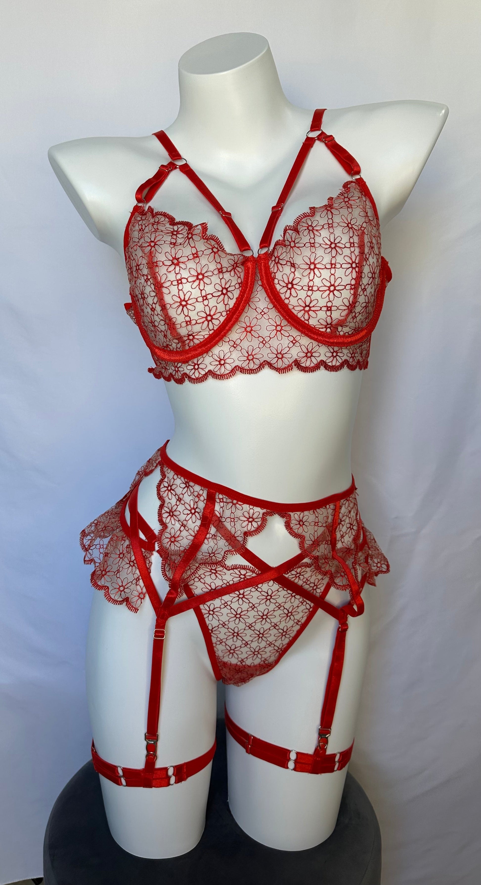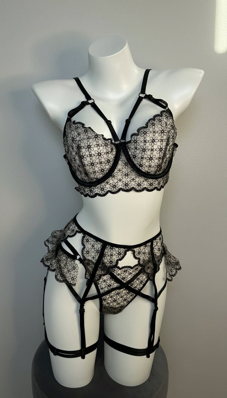 Conjunto de lencería de encaje floral con delicados bordes elegantes.